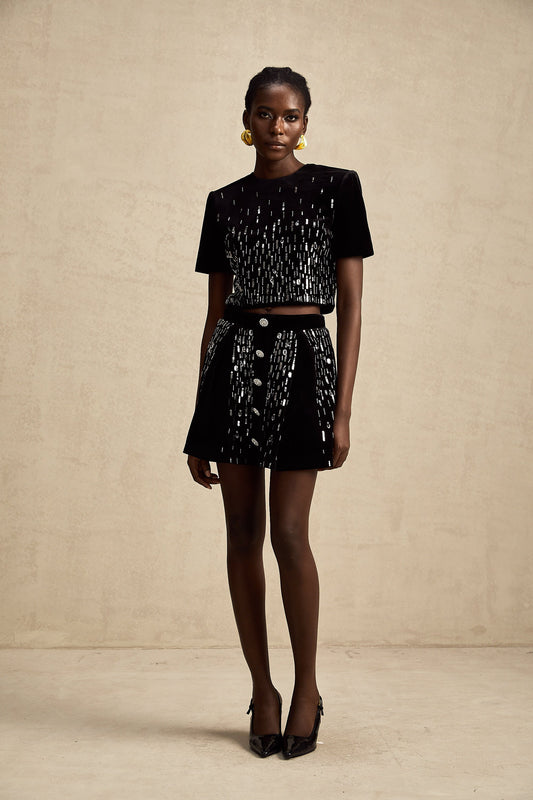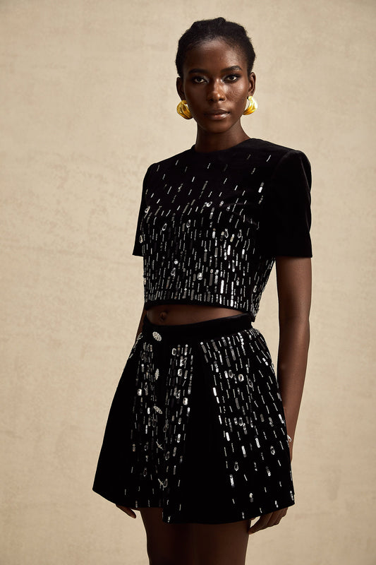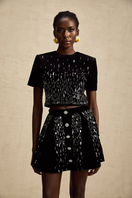 Isabeau black velvet embellished top & skirt matching set (US Only)