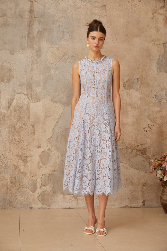 Lison blue embellished floral-lace midi dress