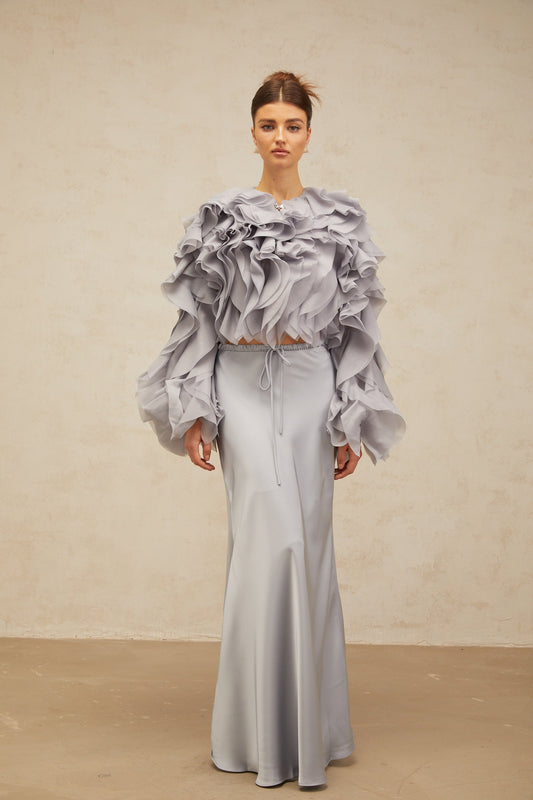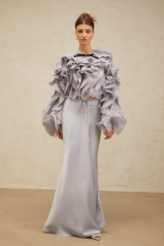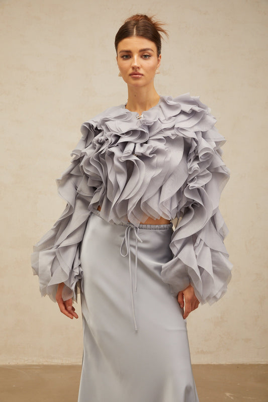Zelda haze-blue bowknot ruffled blouse & skirt matching set