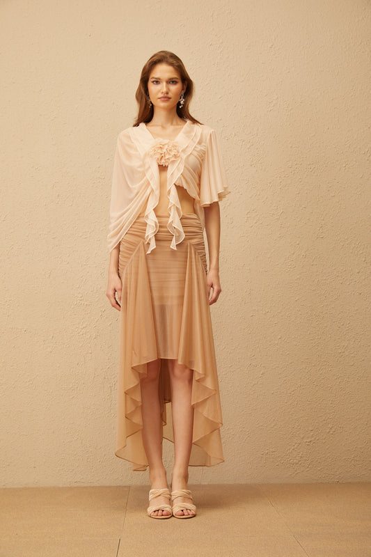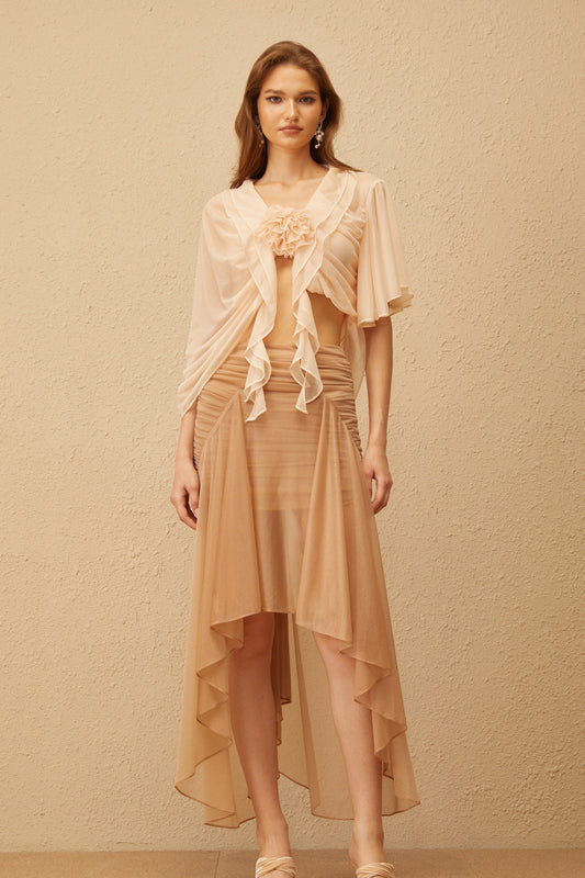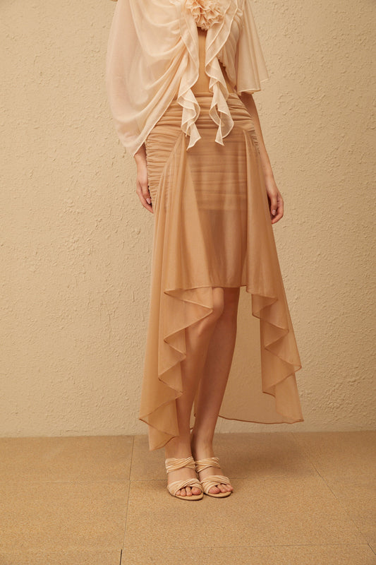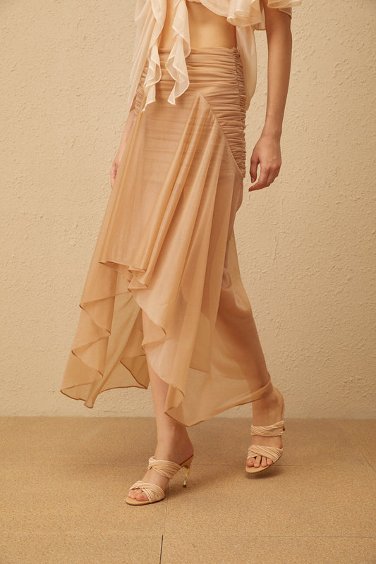Zélie Neutral Ruched Ruffled Hem Midi Skirt