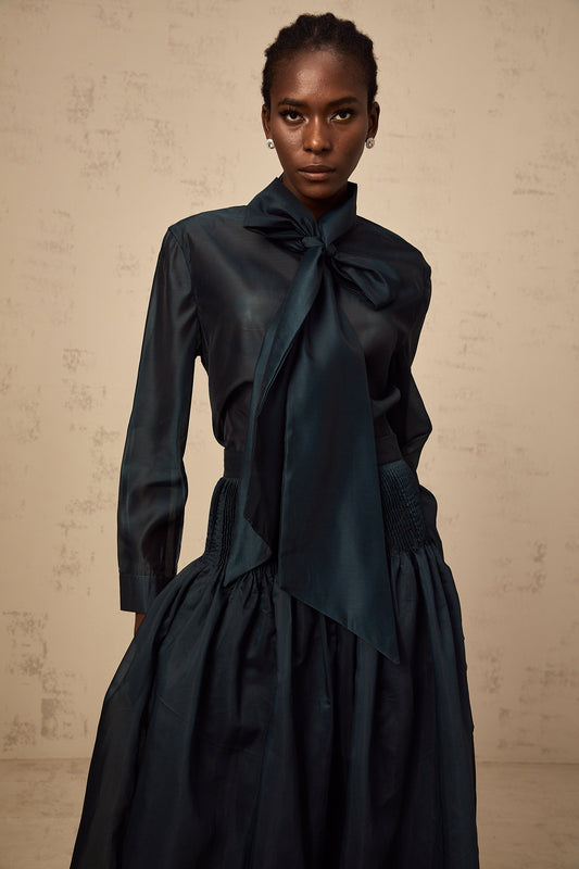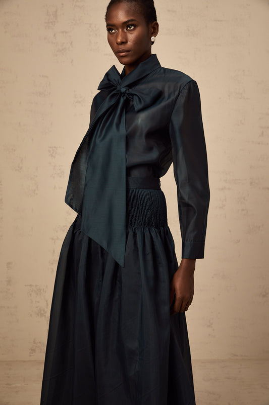 Zoé dark-green ribbon tie-neck shirt & skirt matching set