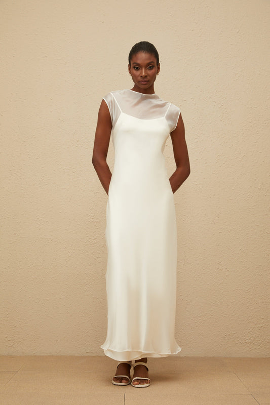 Epurée White Flared Tulle Maxi Dress