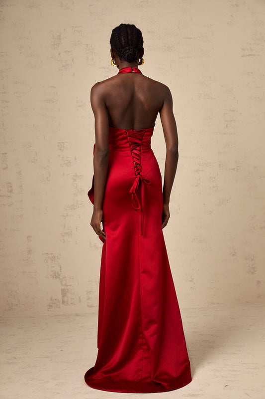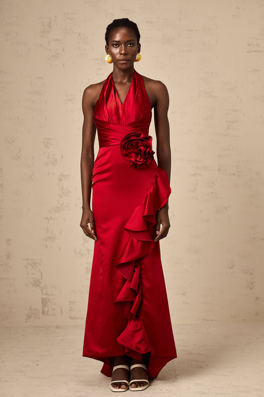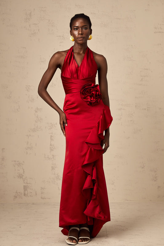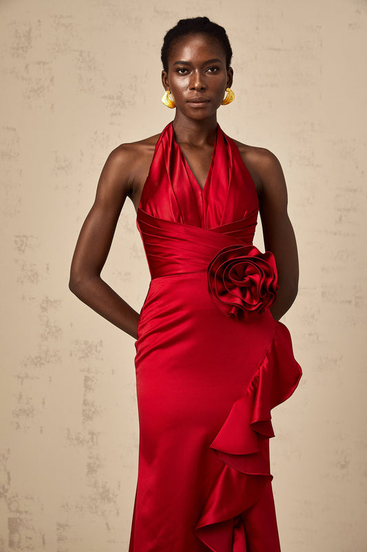 Letizia red halterneck 3d-petal ruffled maxi dress
