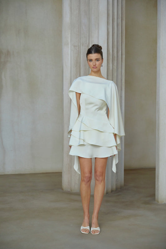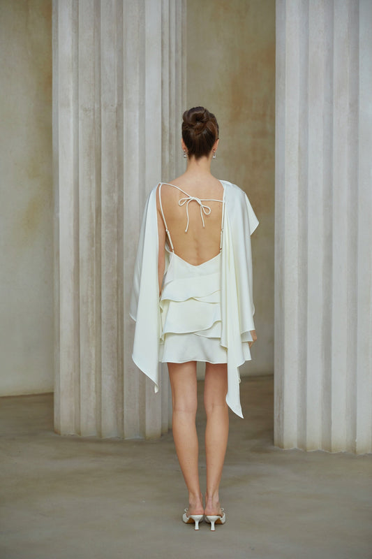 Lyna White Satin Ruffled Mini Dress with Shawl Panel Detail
