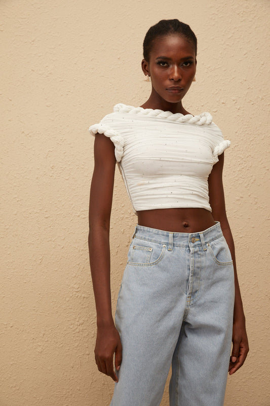 Lisette White Rhinestone Braided Ruched Top