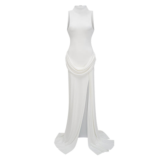 Mystérieuse White Turtleneck Draped Maxi Dress