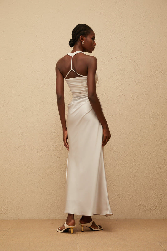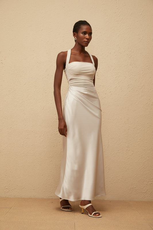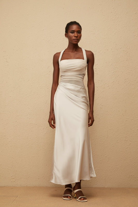 Taina Grey Mesh Panel Ruched Maxi Dress