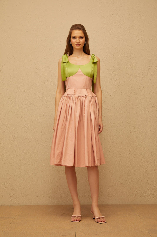 Abrielle Pink Satin Bowknot Strap Midi Dress