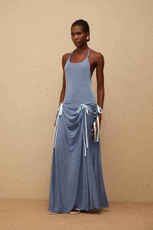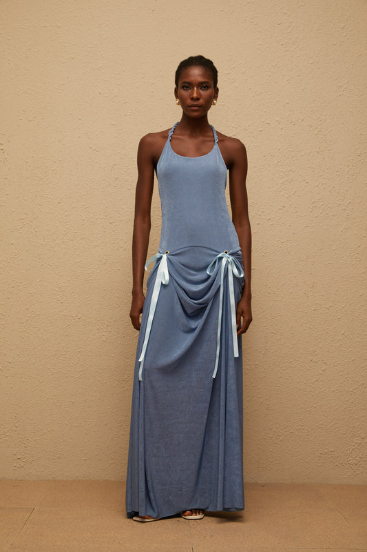 Adèle Blue Bowknot Velvet Maxi Dress