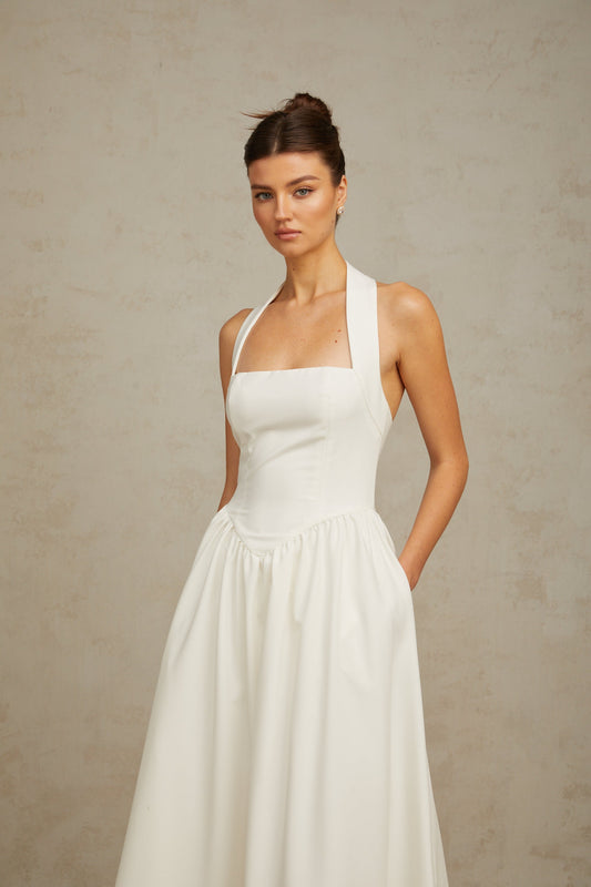 Alizée halterneck pleated midi dress in White