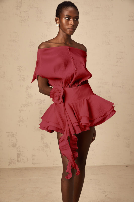 Amélie Red Floral Appliqué Flounced Mini Dress
