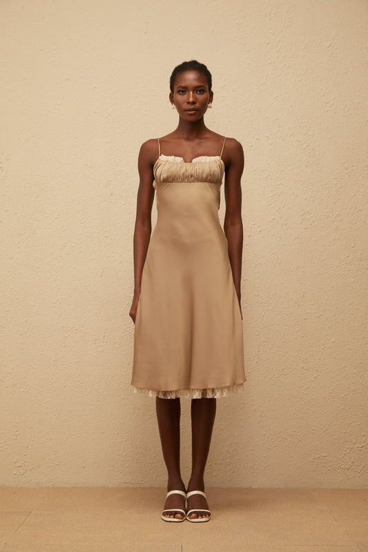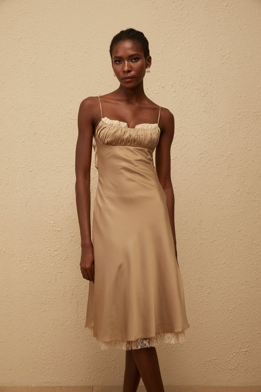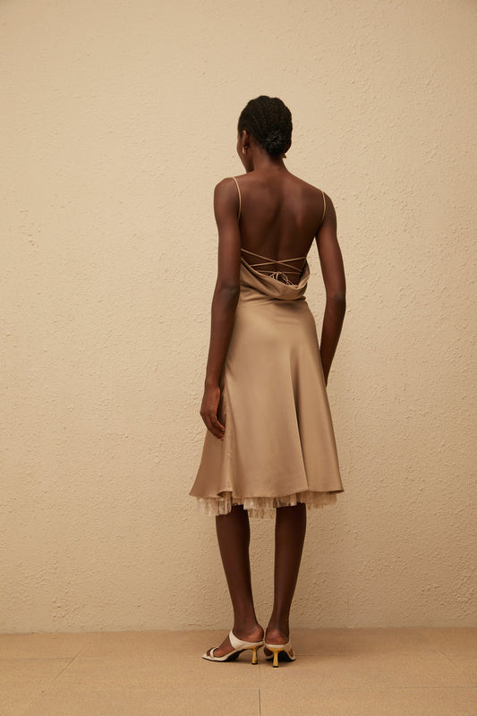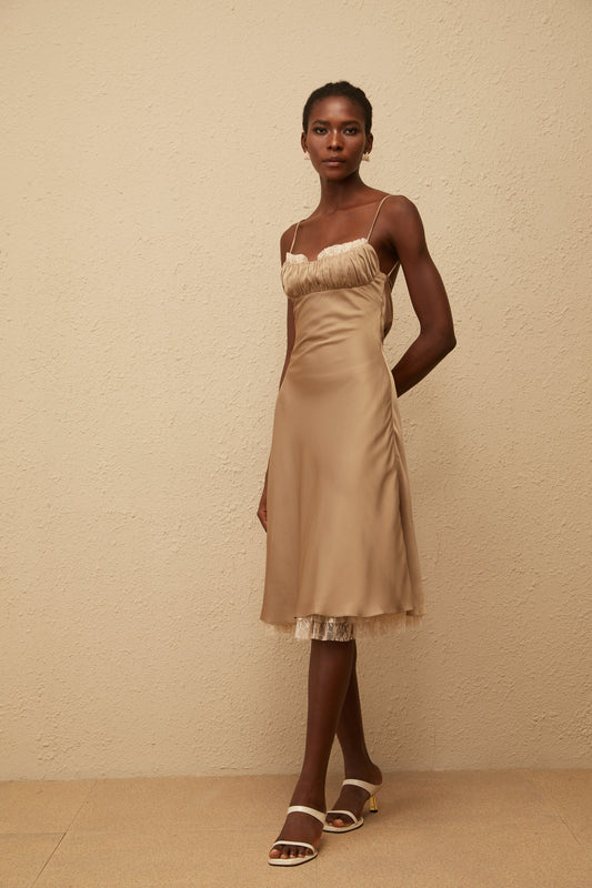 Ananias Khaki Lace Panel Satin Midi Dress